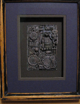 "The Essence of Time" - 2005, Framed assemblage constructed from found objects on heavy cardboard, in a double matted, hand sanded & painted shadow box frame with quality, non-glare glass- "8.75" x 10.75" - Signed on the back of the frame - $495.00